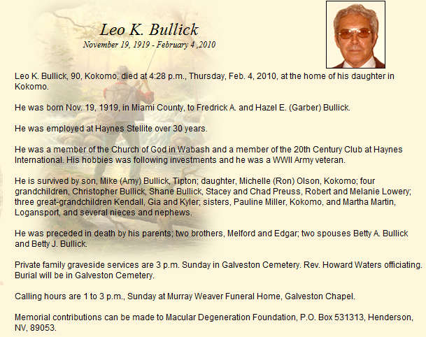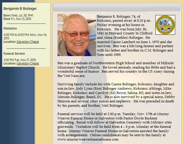 BOLINGERBenjamin B    30 Jul 1941 13 Nov 2015 17 Nov 2015 US Army Vietnam 74  5th Add; Sec 1 309  3
