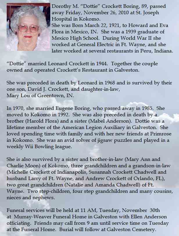 BORINGDorothy Mae CROCKETT Flora  22 Mar 1921 26 Nov 2010 30 Nov 2010  89  5th Add; Sec 1 323  4