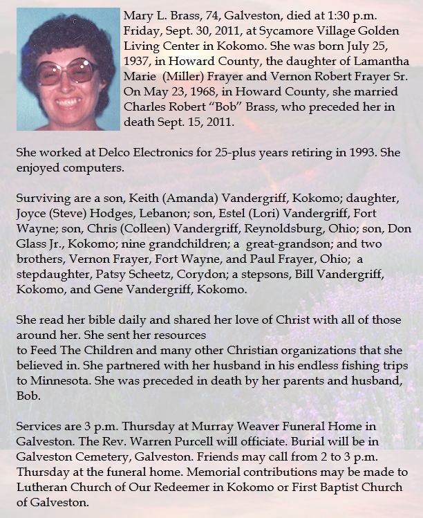 BRASSMary L.  Frayer  25 Jul 1937 30 Sep 2011 6 Oct 2011  74  7th Add Sec 1 300  2