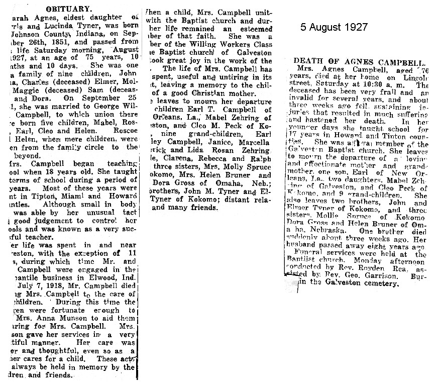CAMPBELLSarah Agnes  Tyner  26 Sep 1851 6 Aug 1927 8 Aug 1927  75  1st Add; Sec 1 62  1 & 2