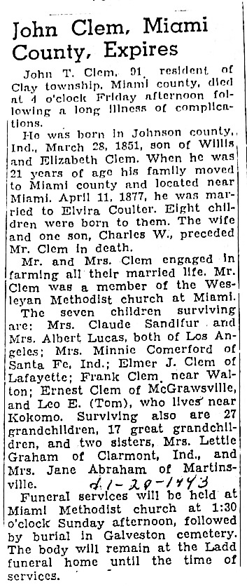 CLEMJohn T.    28 Mar 1851 29 Jan 1943 31 Jan 1943  91  3rd Add; Sec 1 004  3