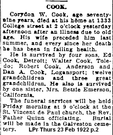 COOKCorydon W    2 Jul 1842 22 Feb 1922 24 Feb 1922 Civil War 79  Old Add 222  5