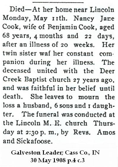 COOKNancy Jane  Patterson  19 Dec 1840 11 May 1908 13 May 1908  67  1st Add; Sec 1 039  2