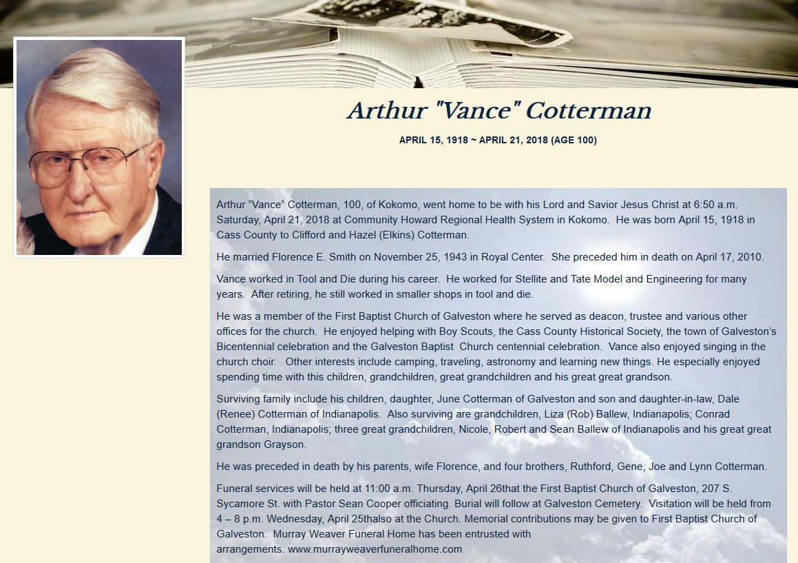 COTTERMANArthur Vance    15 Apr 1918 21 Apr 2018 26 Apr 2018  100  5th Add; Sec 1 148  2