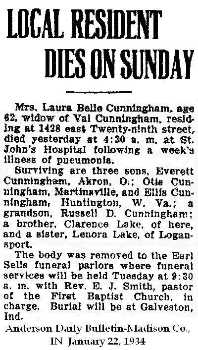 CUNNINGHAMLaura Belle  Lake  7 Aug 1871 21 Jan 1934 24 Jan 1934  62  1st Add; Sec 1 145  4