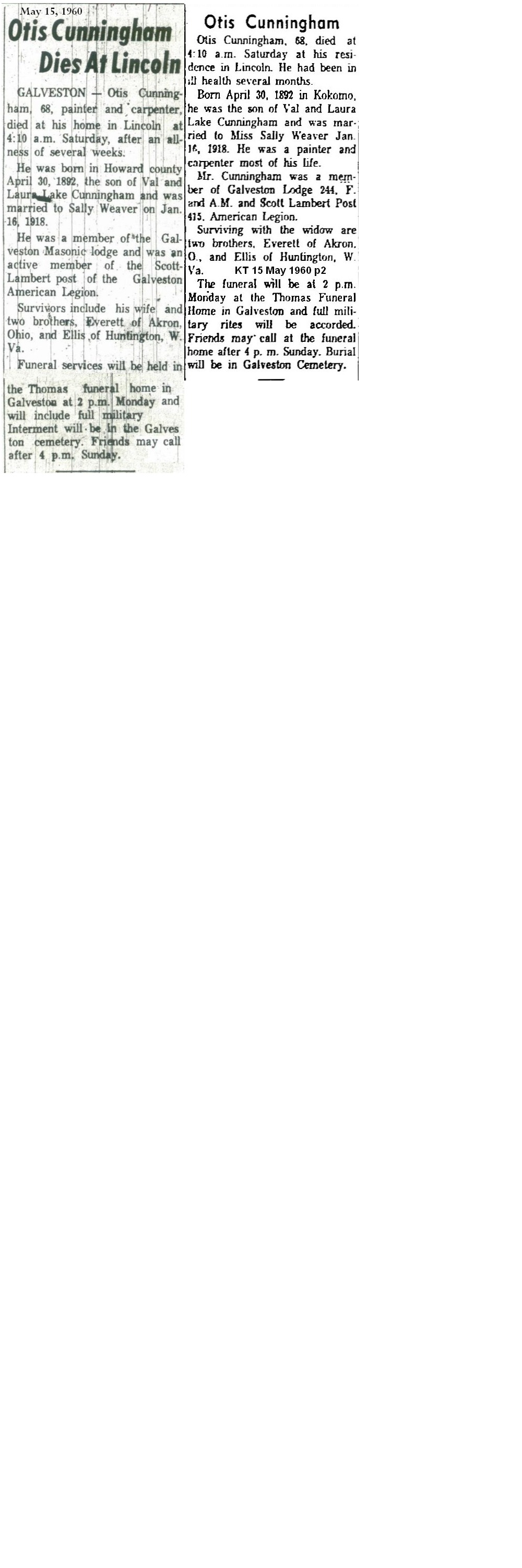 CUNNINGHAMLee Otis    30 Apr 1892 14 May 1960 16 May 1960 Veteran WW I 68  1st Add; Sec 1 105  1