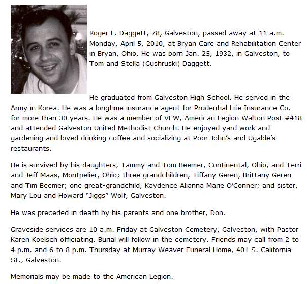 DAGGETTRoger L.    25 Jan 1932 5 Apr 2010 9 Apr 2010 U.S. Army Korea 78  7th Add Sec 1 204  4