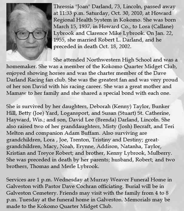 DARLANDThressia "Joan"  Lybrook  15 Mar 1937 30 Oct 2010 3 Nov 2010  73  4th Add; Sec 2 138  1