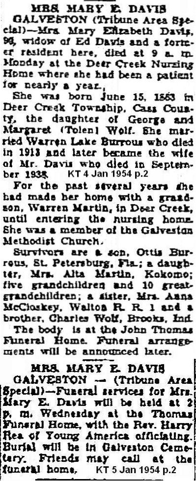 DAVISMary E. Burrous Wolf  15 Jun 1863 4 Jan 1954 6 Jan 1954  90  1st Add; Sec 1 078  2