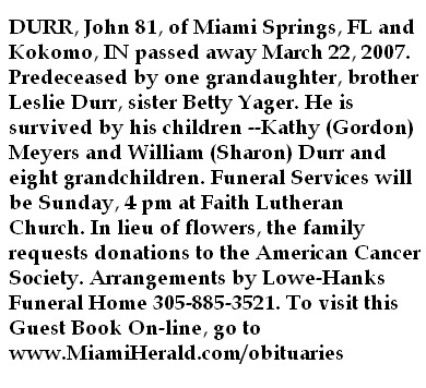 DURRJohn R.    6 Feb 1926 22 Mar 2007 8 Apr 2007  81  2nd Add; Sec 1 158  1