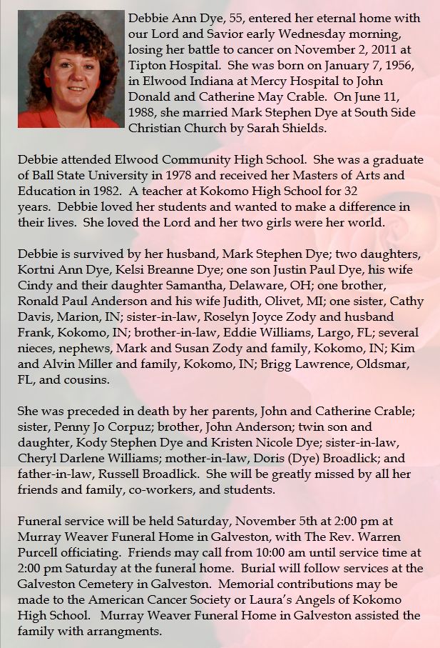DYEDebbie Ann  Crable  7 Jan 1956 2 Nov 2011 5 Nov 2011  55  5th Add; Sec 1 084  1