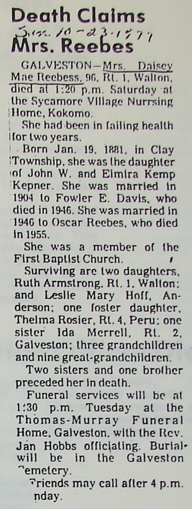 DAVISDaisy Mae aka REEVES  Kepner  19 Jan 1882 22 Oct 1977 25 Oct 1977  95  2nd Add; Sec 1 090  2