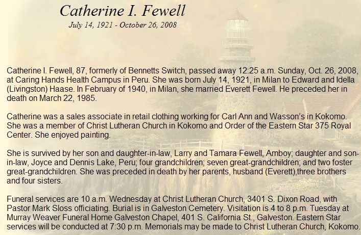 FEWELLCatherine I.  Haase  14 Jul 1921 26 Oct 2008 29 Oct 2008  87  5th Add; Sec 3 250  4