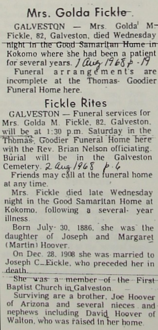 FICKLEGolda Mae  Hoover  30 Jul 1886 31 Jul 1968 3 Aug 1968  82  3rd Add; Sec 1 041  2