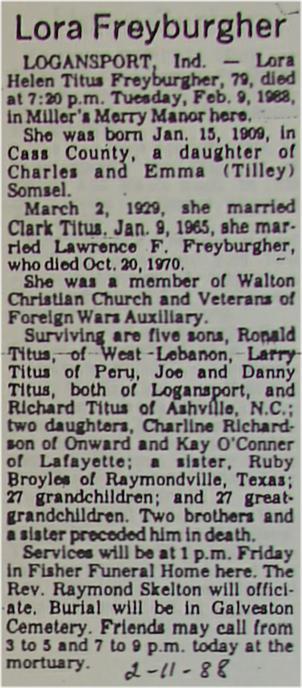 FREYBURGHERLora Helen Titus  Somsel  15 Jan 1909 9 Feb 1988 12 Feb 1988  79  4th Add; Sec 1 057