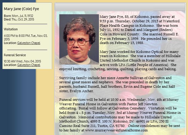 FYEMary Jane  Cole  11 Jul 1932 29 Oct 2015 4 Nov 2015  83  Midway Add; Sec 1 001  2
