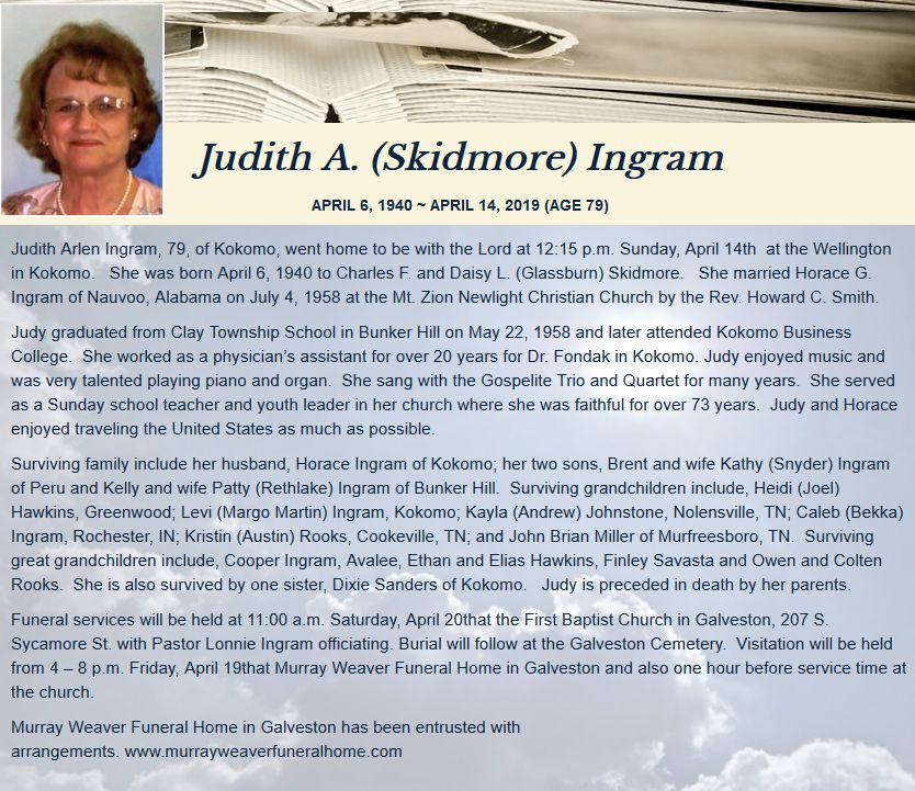 INGRAMJudith A  Skidmore  6 Apr 1940 14 Apr 2019 20 Apr 2019  79  1st Add; Sec 1 103  5