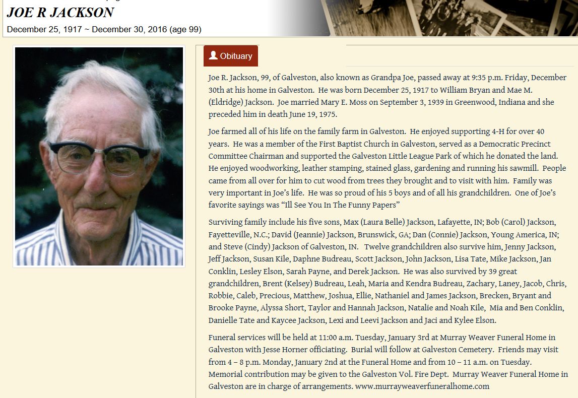JACKSONJoe R.    25 Dec 1917 30 Dec 2016 3 Jan 2017  99  3rd Add; Sec 1 128  5