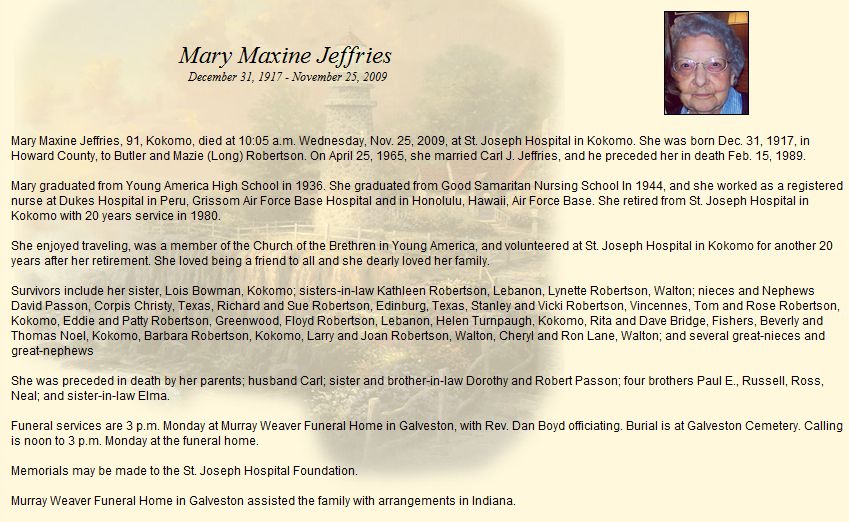 JEFFRIESMary Maxine  Robertson  31 Dec 1917 25 Nov 2009 30 Nov 2009  91  3rd Add; Sec 1 126  6