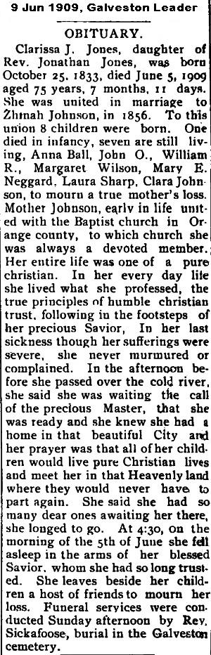 JOHNSONClarisa J. Jones    25 Oct 1833 5 Jun 1909   75  1st Add; Sec 1 056  1