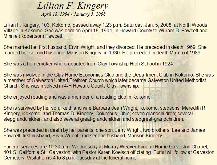 KINGERYLillian Wright  Fawcett  18 Apr 1904 5 Jan 2008 9 Jan 2008  103  1st Add; Sec 1 018
