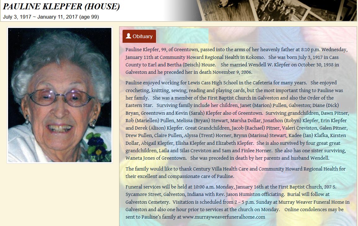 KLEPFERPauline H  House  3 Jul 1917 11 Jan 2017 16 Jan 2017  99  3rd Add; Sec 1 199  6