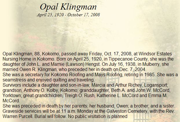 KLINGMANOwen R.    3 Jan 1914 7 Dec 2004 11 Dec 2004  90
