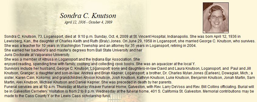 KNUTSONSondra C.  Jones  12 Apr 1936 4 Oct 2009 8 Oct 2009  73  4th Add; Sec 1 032  2