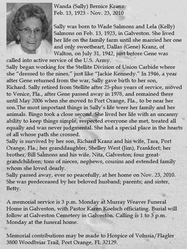 KRANZWanda Bernice "Sally"  Salmons  13 Feb 1923 23 Nov 2010 29 Nov 2010  87  4th Add; Sec 1 089  2