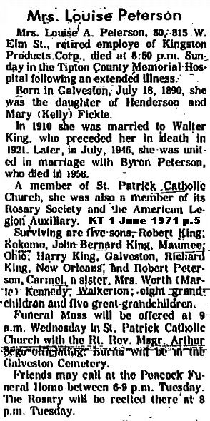 KING PETERSONLouise A.  Fickle  18 Jul 1890 30 May 1971 2 Jun 1971  80  2nd Add; Sec 1 102  1