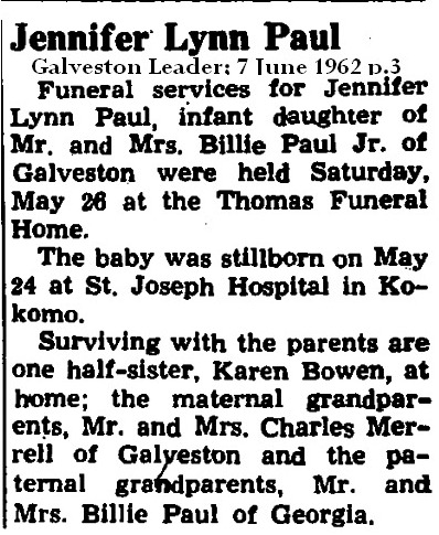 PAULJennifer Lynn    24 May 1962 24 May 1962 26 May 1962  INF  2nd Add; Sec 1 117  5