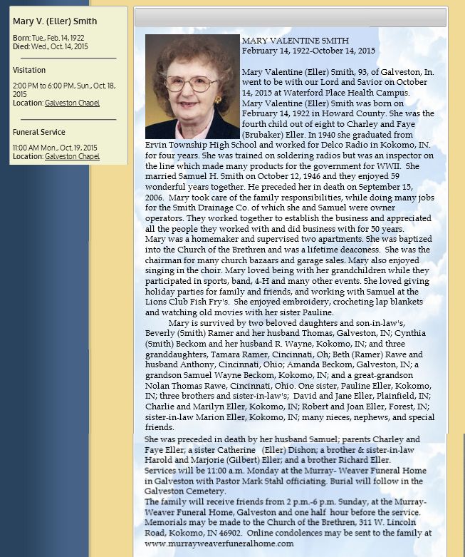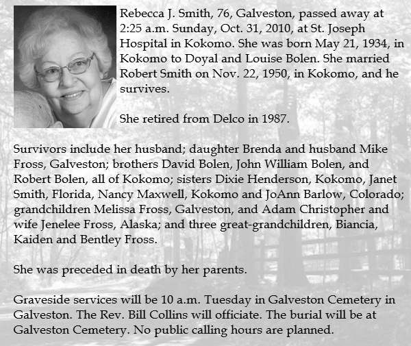 SMITHRebecca J.  Bolen  21 May 1934 31 Oct 2010 2 Nov 2010  76  5th Add; Sec 1 325  4