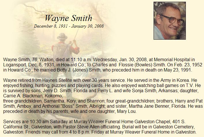 SMITHWayne     8 Dec 1931 30 Jan 2008 2 Feb 2008 US Army Korea 506  4th Add; Sec 2 123  3