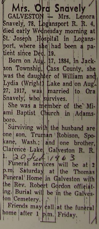 SNAVELYLenora  Lake  17 Aug 1884 20 Feb 1963 23 Feb 1963  78  1st Add; Sec 1 144  4
