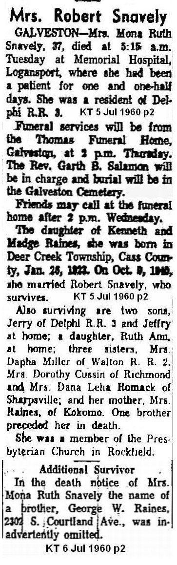 SNAVELYMona Ruth  Raines  28 Jan 1923 5 Jul 1960 7 Jul 1960  37  3rd Add; Sec 1 066  4