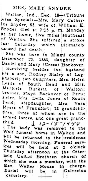 SNYDERMary Catherine  Bockover  20 Dec 1880 18 Dec 1944 19 Dec 1944  63  3rd Add; Sec 1 010  2