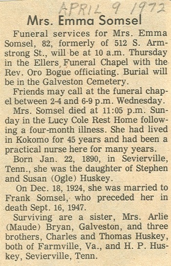 SOMSELEmma A  Huskey  22 Jan 1890 9 Apr 1972 13 Apr 1972  82  2nd Add; Sec 1 055  3