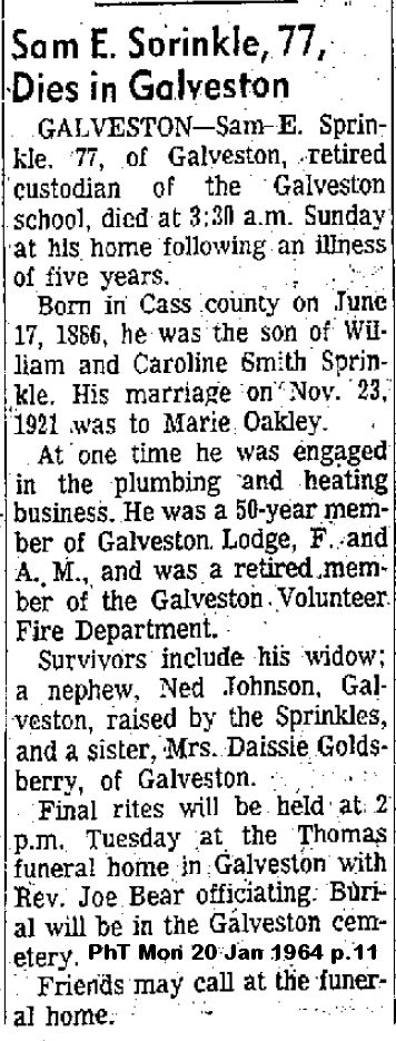 SPRINKLESam E    17 Jun 1886 19 Jan 1964 21 Jan 1964  77  3rd Add; Sec 1 061  2