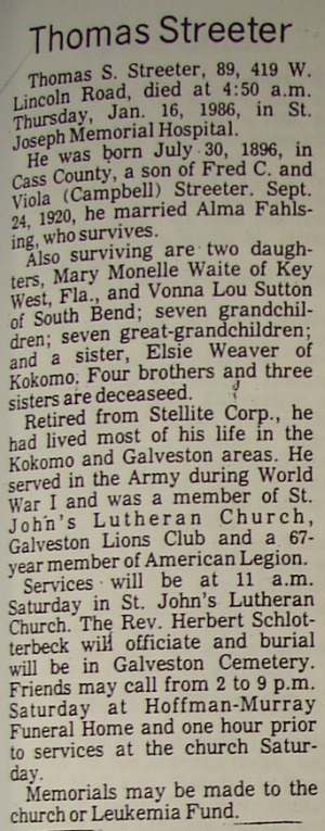 STREETERThomas S    30 Jul 1896 16 Jan 1986 18 Jan 1986 US Army WWI 89  3rd Add; Sec 1 065  1