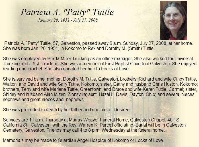 TUTTLEPatricia Ann (Miss)   26 Jan 1951 27 Jul 2008   57  5th Add; Sec 3 095