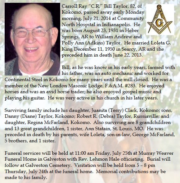 TAYLORCarroll Ray "C.R." Bill    23 Aug 1931 21 Jul 2014 25 Jul 2014  82  2nd Add; Sec 1 117  5