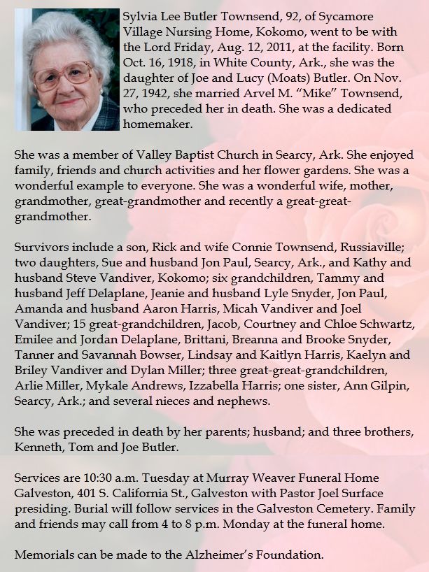TOWNSENDSylvia L  Butler  16 Oct 1918 12 Aug 2011 16 Aug 2011  92  5th Add; Sec 1 102  2