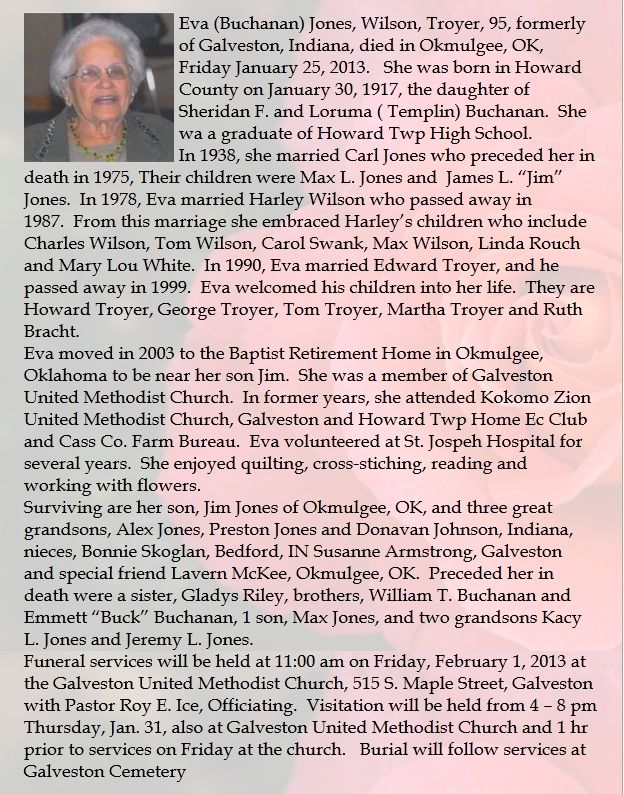 TROYEREva Jones Wilson  Buchanan  30 Jan 1917 25 Jan 2013 1 Feb 2013  95  3rd Add; Sec 1 049  4