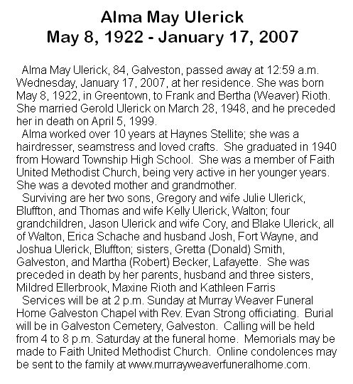 ULERICKAlma May  Rioth  8 May 1922 16 Jan 2007 20 Jan 2007  84  5th Add; Sec 1 078