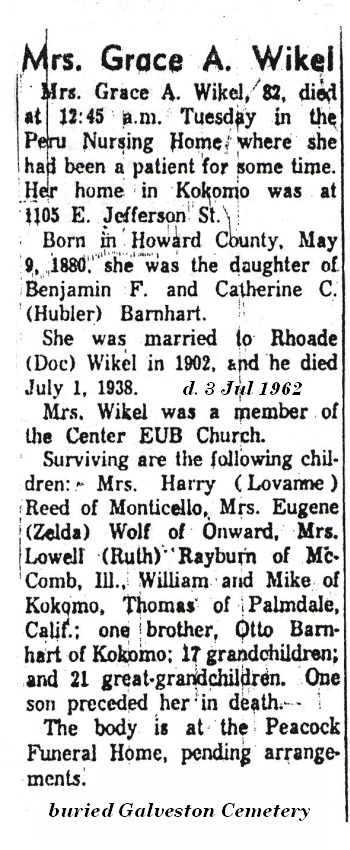 WIKELGrace M.  Barnhart  9 May 1880 3 Jul 1962 6 Jul 1962  82  IOOF Add 023  5