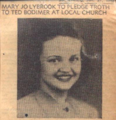 Exchanging nuptial vows in a double ring ceremony before the altar of the Ninth Street Christian Church will be Miss Mary Josephine Lybrook and Theodore B. Bodimer, at 2 o'clock Sunday afternoon. Miss Lybrook is the daughter of Dr. and Mrs. D.E. Lybrook, of Galveston route two. Parents of Mr. Bodimer are Mr. and Mrs. Gilbert E. Bodimer, 3012 North Winfield, Indianapolis.