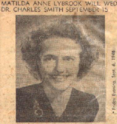 Dr. and Mrs. D. E. Lybrook of Young America announce that their daughter, Matilda Anne, will become the bride of Dr. Charles Glenn Smith of Indianapolis on September 15 in the Ninth Street Christian Church in Logansport. Rev. Thomas Luke of Argos, Indiana, assisted by Rev. H.D. Hosier will read the marriage vows at 3:30 in the afternoon. The groom is the son of Mr. and Mrs. Paul Smith, Sr. of Indianapolis. Miss Lybrook graduated from Young America High School and attended Indiana University for two years, where she was a member of Alpha Omicron Pi. She graduated from the Indiana University Training School for Nurses and has been employed at the Cass County Hospital and in Florida. Dr. Smith completed his under-graduate work at Purdue University and received his doctorate from the Indiana University School of Medicine. He is a member of Phi Beta Pi, medical fraternity. He was recently released from the Navy as a Lieutenant (jg). The engagement of the young couple was announced at a luncheon bridge at the Riviera Club in Indianapolis given recently by Mrs. Robert Blackman and Mrs. Paul Lybrook, sister and sister-in-law of the bride-to-be.